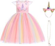 Mjukt material: Tillverkad av högkvalitativ polyester- och bomullsblandning för den känsliga huden på din ängel flicka. Attraktivt utseende: Axelbandslös golvlängd, populär detalj, elegant enhörningsdräkt, mönstrad design som ger dina döttrar ett gott humör.